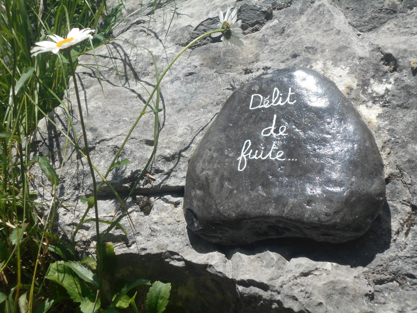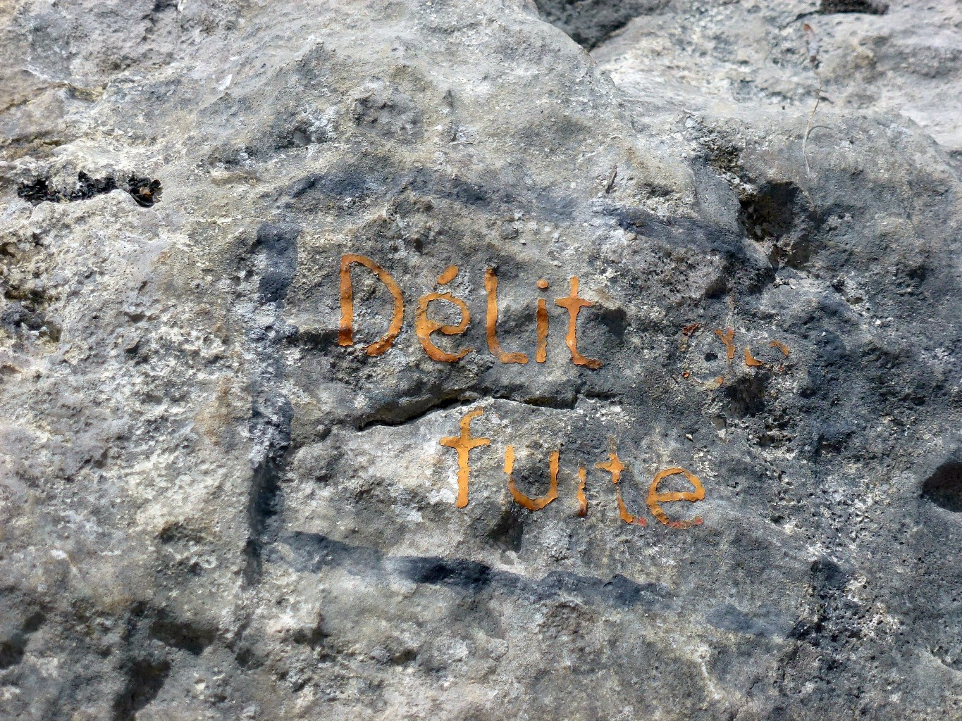 - Délit de fuite se situe après le secteur des moulinettes et avant une grotte. Le nom de la voie est peint sur un galet collé au départ.