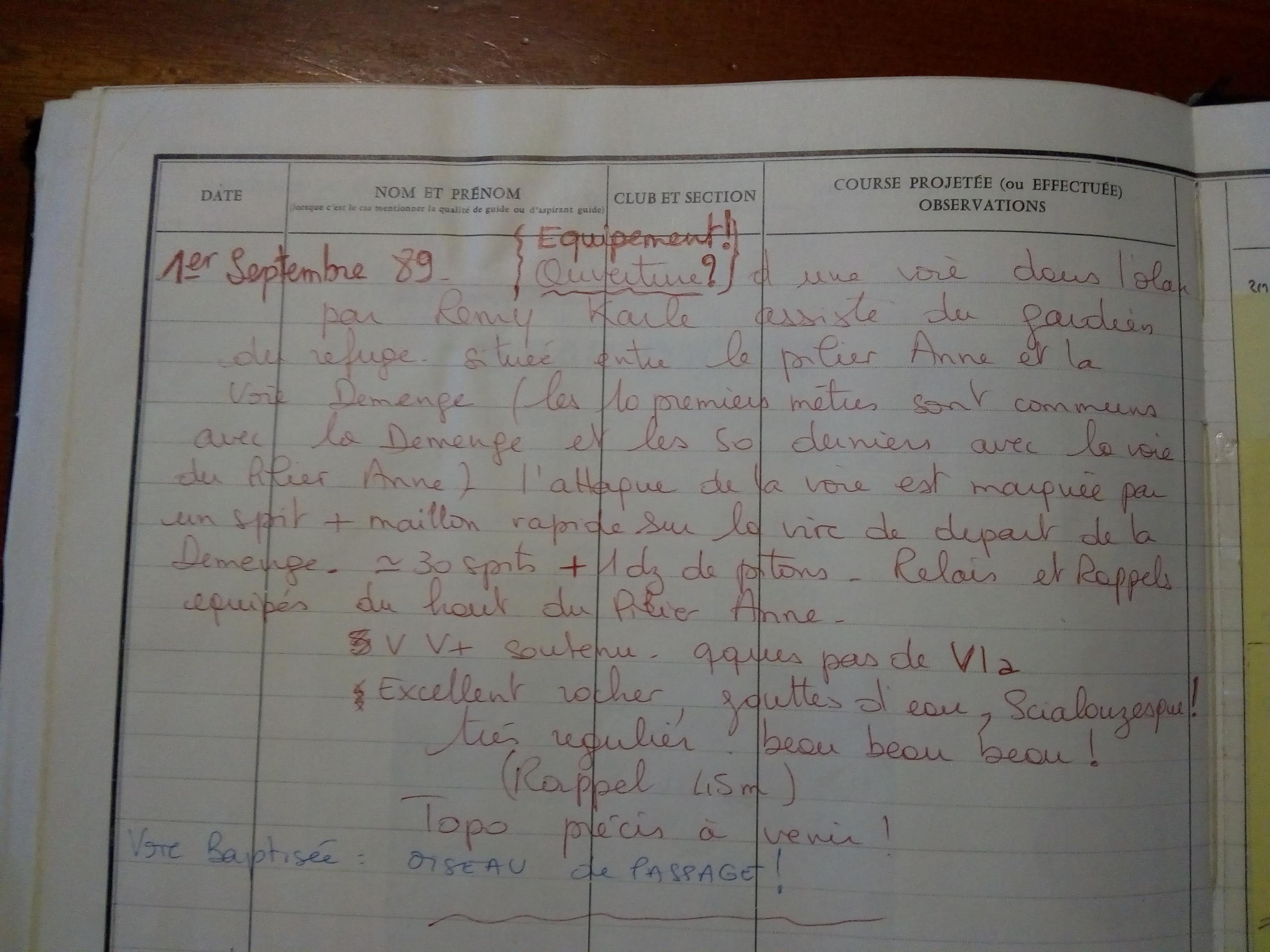 Pour L11 & L12, il est possible de continuer dans le dièdre sans aller au relais de L11 (à droite à l’extérieur du dièdre) pour rejoindre le relais sur spits de la voie Pilier Anne. Facile, 4. La suite est alors dans du 3 le long de l'arête, dans un rocher moyen.
