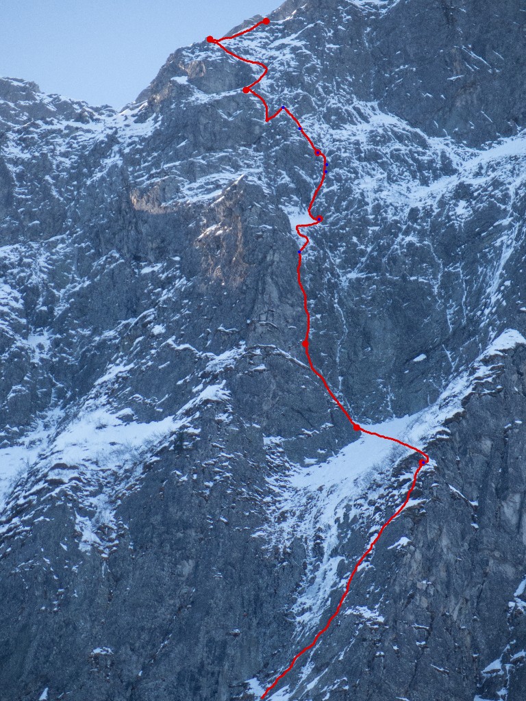 L# | M4 | 60 m | Suivre la goulotte évidente, M4 soutenu pas facile à protéger, puis suivre une petite rampe vers la droite. Remonter la pente de neige sommitale en visant à gauche de 2 petits blocs. R# sur une vire jute derrière l'arête.