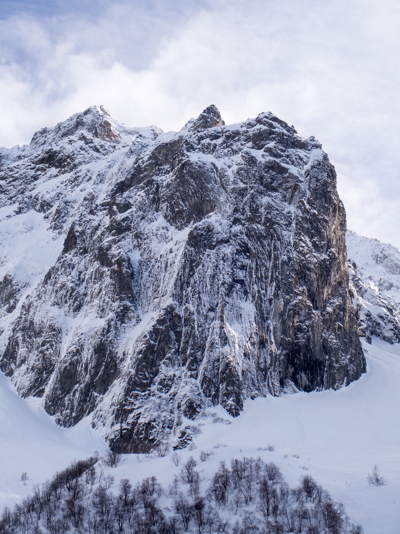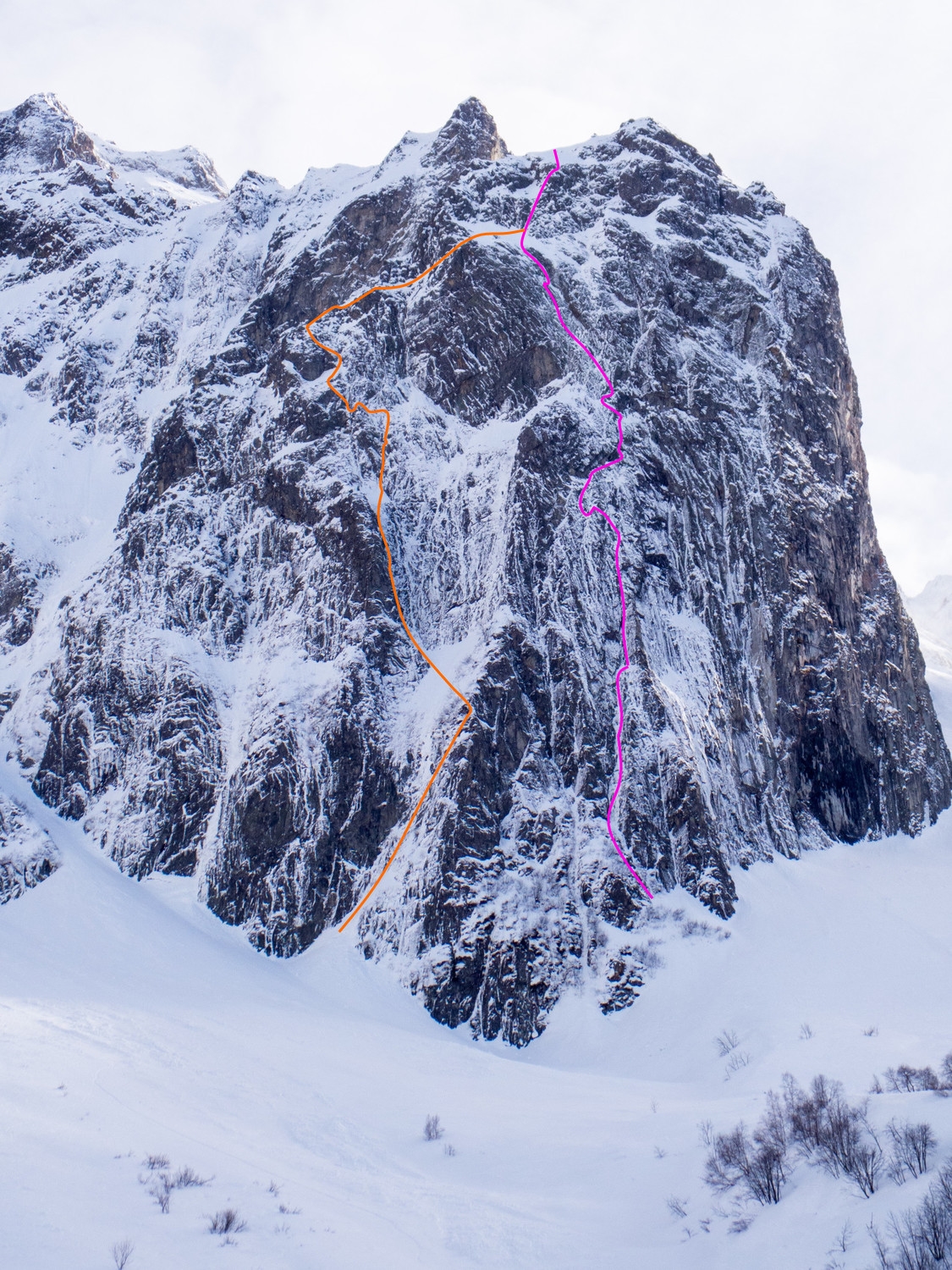 L# | M4+ | 35 m | Partir droit puis de suite en ascendance légèrement à gauche pour rejoindre un pilier rocheux fissuré sur lequel on se rétablit. Au niveau d'un piton avec rallonge et maillon redescendre quelques mètres derrière ce pilier puis par un pas en traversée (petite vire) prendre pied dans une petite goulotte, s'en échapper à gauche après quelques mètres, R# sur 2 spits juste au-dessus.