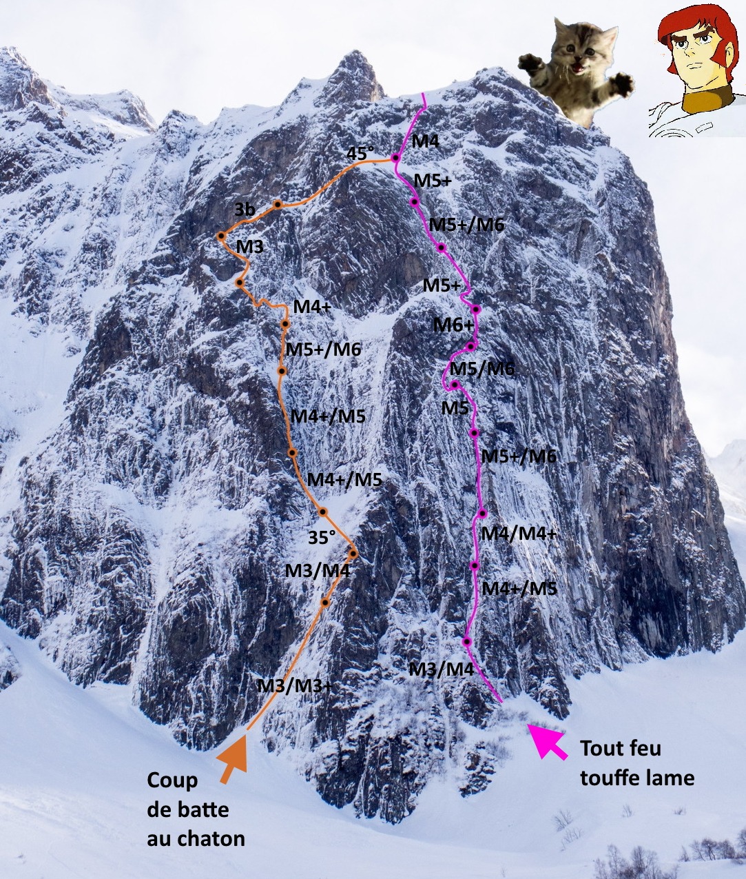 L# | M5+/M6 > M4+/A1 | 30 m | Goulotte au-dessus du relais (légèrement à droite) puis court mur, possible en artif, 2 pitons en place. R# au niveau d'un becquet décollé (1 piton,1 spit).