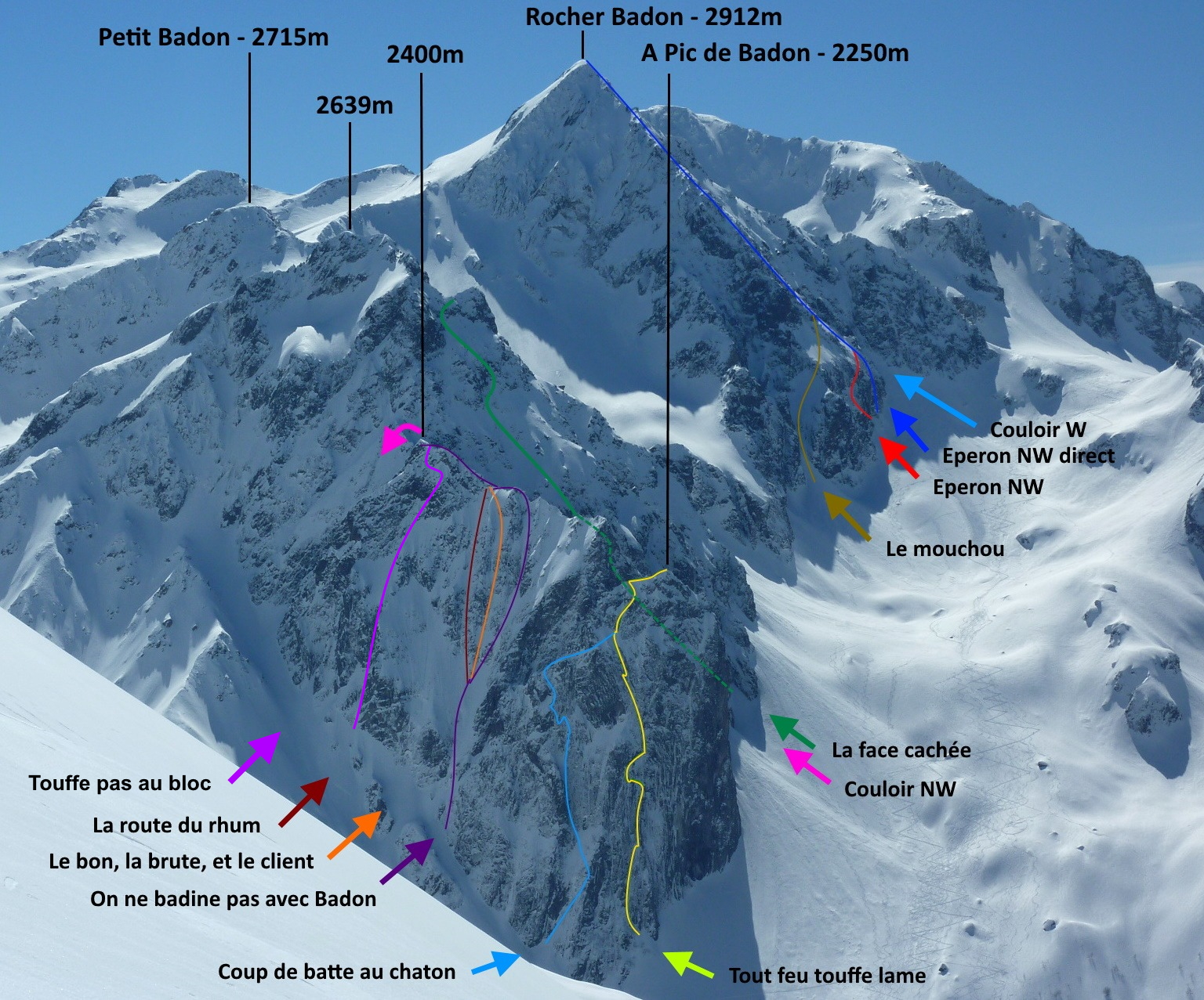 Un enchaînement intéressant et logique: gravir "Coup de Batte" jusqu'à R8; descendre en rappels dans le couloir E, puis gravir une des goulottes "On ne badine pas avec Badon" / "Le bon la brute et le client" / "La route du rhum". Mais on se prive du sommet, il faudra donc revenir gravir "Tout feu touffe lame" dans ce cas!