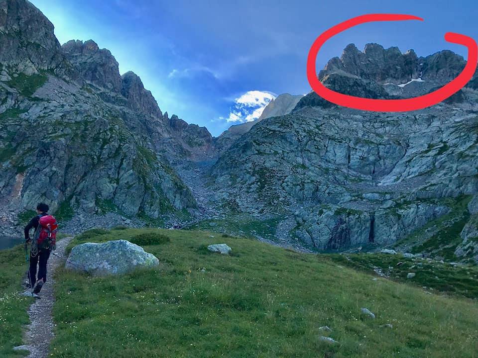 Pont du Countet, lac Autier, base du socle à vue si intégrale (variante Gounand) ou bêche à doite du premier gendarme à vue si originale (première Vernet).
