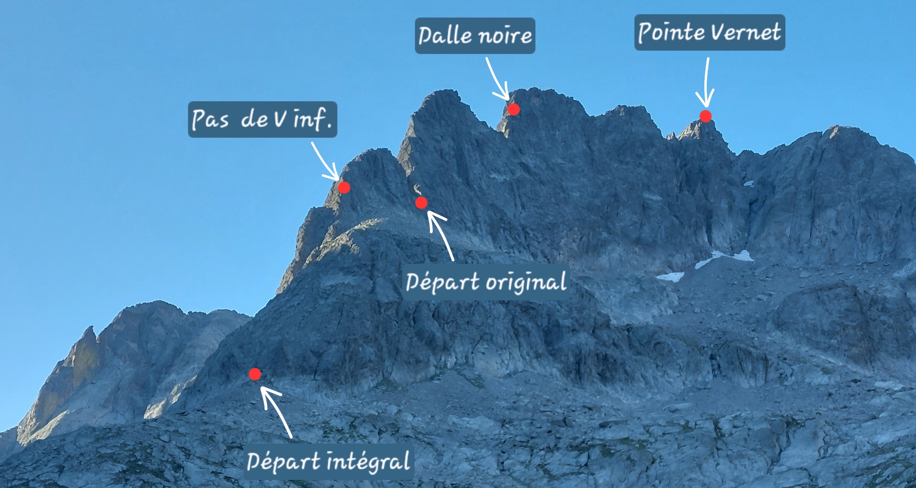 Au sommet de cette première petite pointe, désescalader sur le fil pour rejoindre la brèche de départ de l'itinéraire Vernet original. Remonter en face sur le fil sur près de 30m (II/III inf.) pour arriver sur une deuxième pointe. La desescalder (aérien) sur son fil (traces d'un ancien éboulement) jusqu'à une petite vire caillouteuse. Continuer à désescalader sur le fil pour franchir une petite brèche secondaire et prendre pied sur un bitard. Le désescalader versant Ouest (à droite) le long d'une fissure / dièdre pour rejoindre la brèche principale. Laisser le fil à gauche pour partir environ 8m à droite et remonter sur 30m un mur raide qui se transforme en belle dalle fissurée en excellent rocher (anneau de corde rouge), puis faire relais en ressortant sur le fil de l'arête, sur une terrasse assez large (2 gros blocs), au pied d'une dalle avec un vieux piton bien visible à 2,5m. Commencer un peu à gauche du piton, puis revenir légèrement à droite sur une rampe. De là deux possibilités, soit continuer tout droit en restant juste à gauche du fil de l'arête dans une belle fissure/dièdre (sortie en rocher délicat), soit continuer la rampe à droite et franchir le fil de l'arête à droite pour se rétablir dans une dalle compacte côté Ouest (25m). Faire relais sur un petit béquet sur le fil de l'arête. Poursuivre quelques dizaines de mètres sur la large arête qui s'horizontalise pour atteindre le sommet de la troisième pointe. 5m en contre-bas légèrement à gauche, repérer un relais sur béquet (ficellous à changer régulièrement). De là, faire un rappel de 12m ou désescalader (technique) soit légèrement à gauche du rappel (petit pas plus difficile en partie basse pour revenir dans l'axe du rappel au niveau d'une dalle raide et lisse), soit sur le fil de l'arête depuis le sommet de la pointe (4/5m à droite du rappel, fissure raidebau début). Après avoir pris pied dans une brèche au pied du rappel, remonter sur le fil pour atteindre la quatrième pointe (crapahute). Désescalader cette quatrième pointe sur le fil toujours au début puis le quitter quelques mètres à gauche pour descendre dans une dalle rouge couchée évidente. Se positionner 2m en contre-bas de la brèche côté Ouest au pied du ressaut clef. Traverser 6/8m à droite du fil au-dessus du couloir Ouest, prendre un dièdre raide et prisu. Lorsque celui-ci se redresse, traverser 3m à gauche pour se rétablir sur le fil, puis continuer jusqu'à arriver sur une terrasse au pied d'une terrible dalle noire (anneau de corde en place, relai, 30m, IV). Gravir la dalle noire, d'abord tout droit au-dessus du relai jusqu'à une première virette, puis légèrement à gauche jusqu'à une seconde virette, revenir à droite dans l'axe d'une fine fissure (broche inox utilisée comme piton cachée à droite), remonter la fine fissure puis traverser à gauche sur bonnes prises (IV sup.). Le sommet de la dalle noire marque la fin des difficultés. On se trouve sur la cinquième pointe, le piton 2826m.