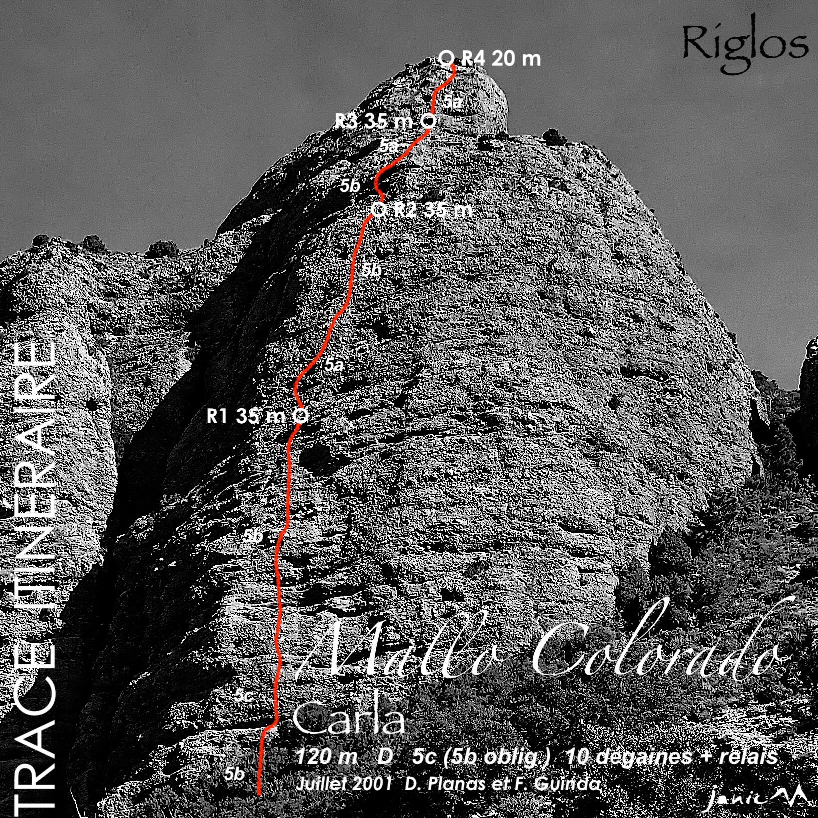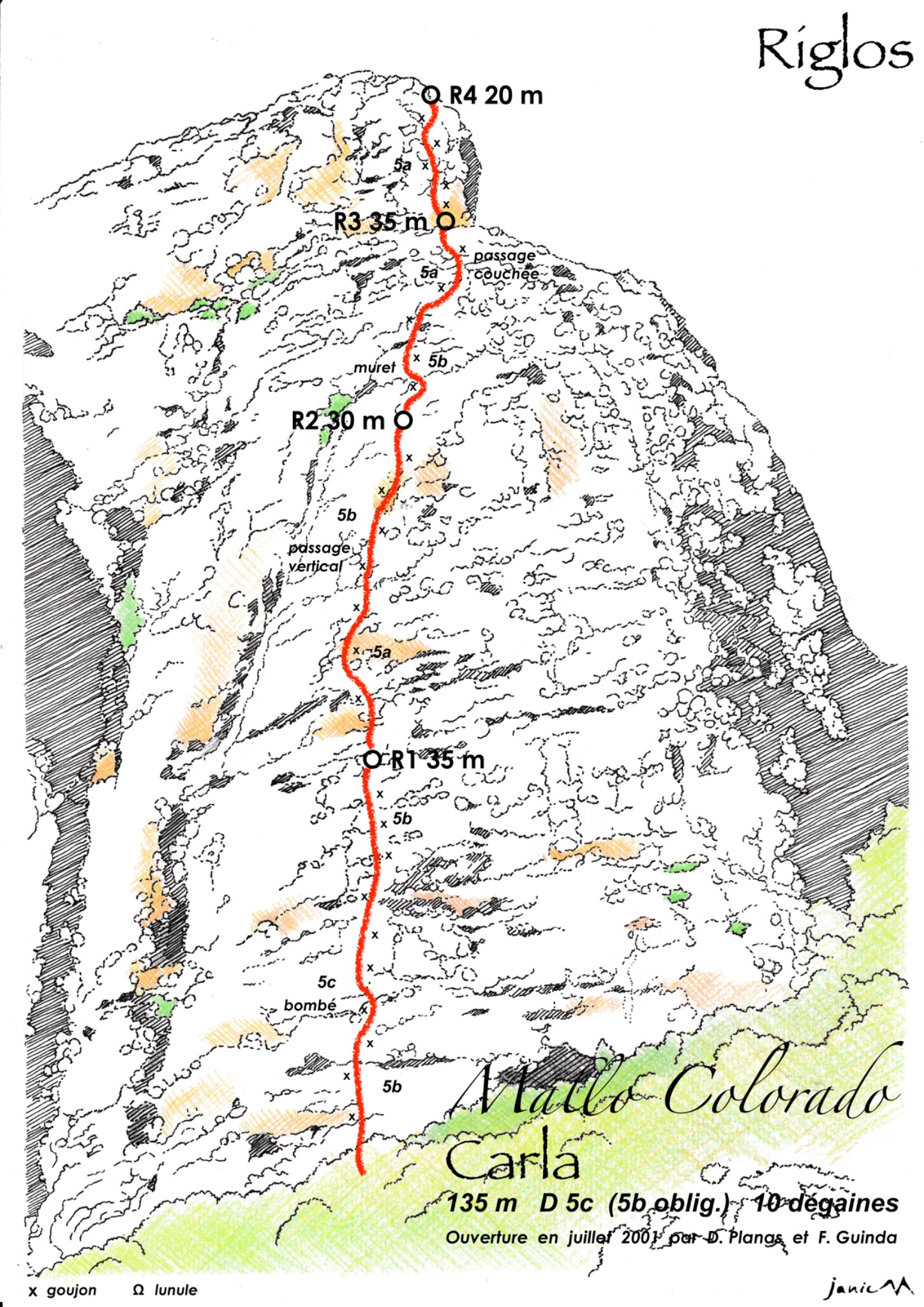 L#| 5b/5c/5b | 35 m | 10 pts | De la plateforme tout droit jusqu'au panza, qui présente un pas de bloc inévitable, puis moins soutenue jusqu'au R#.