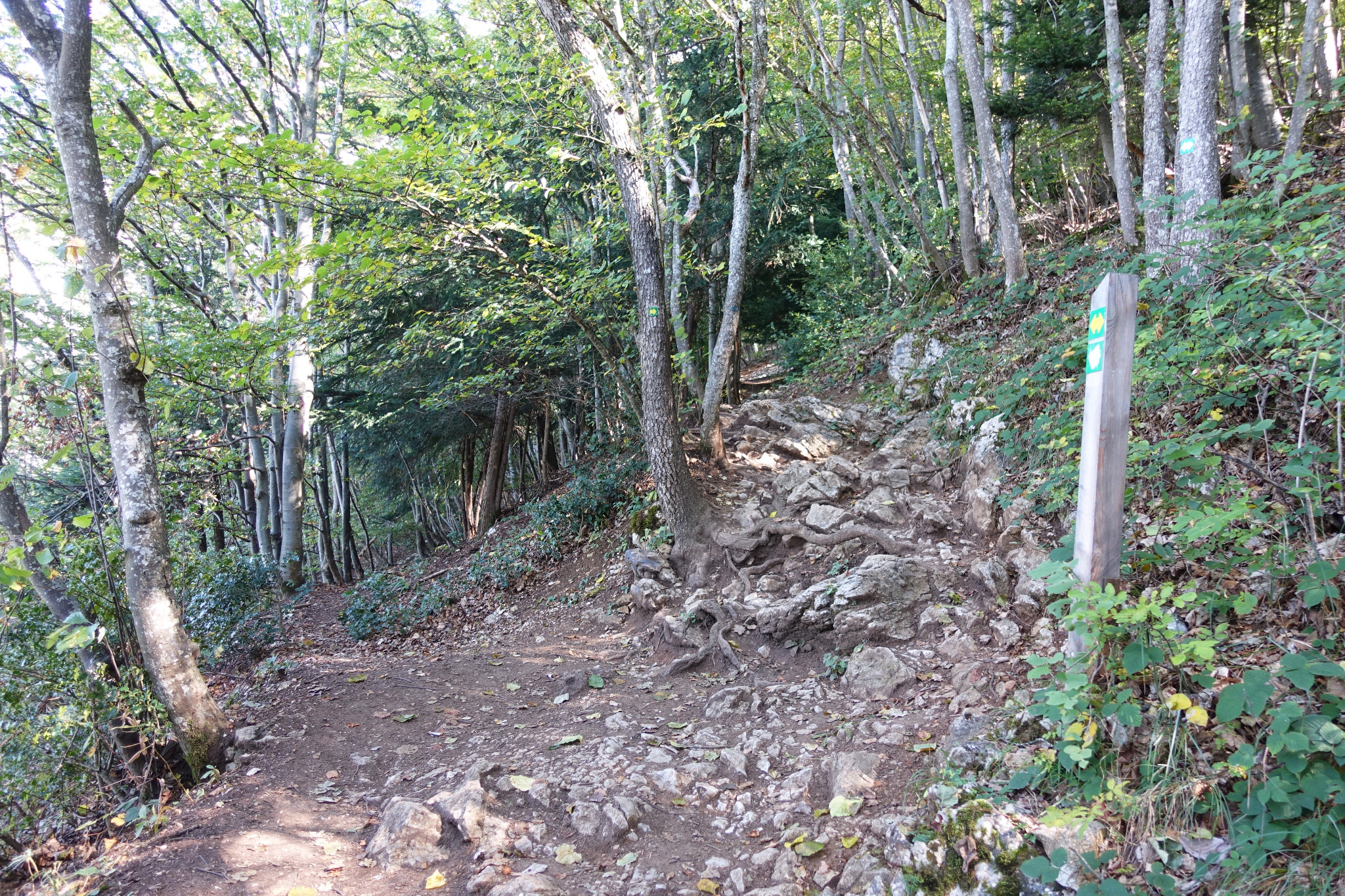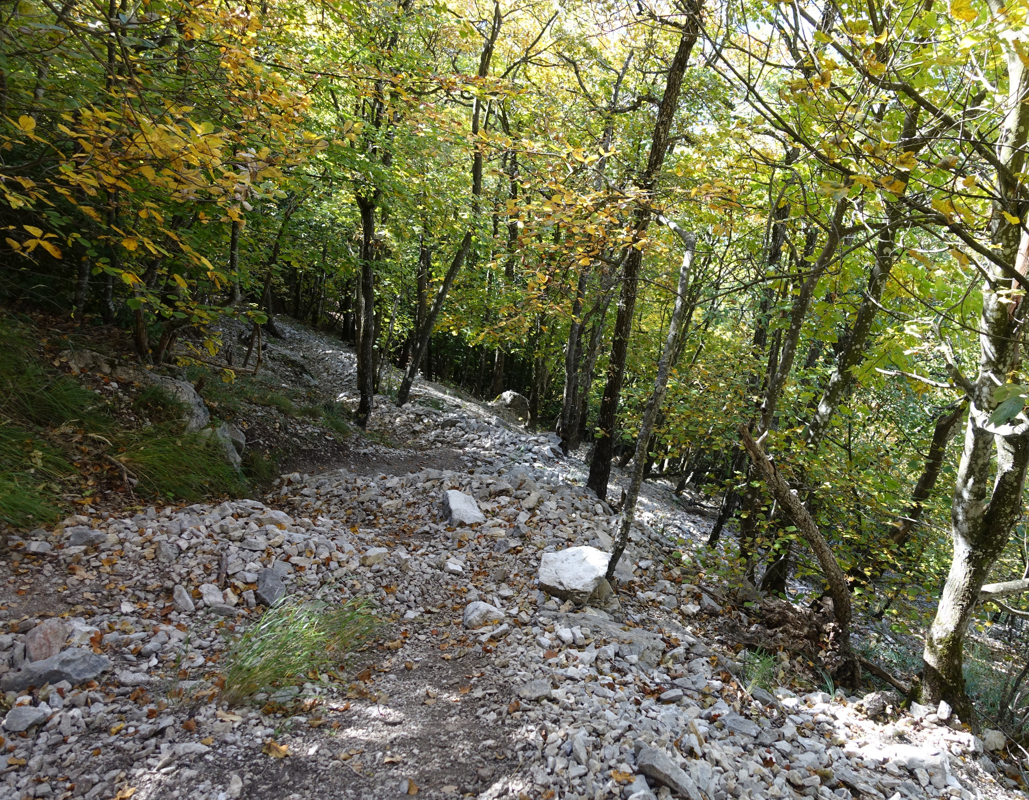 Après quelques montées descentes, le sentier traverse une ravine puis remonte à une brèche par un petit couloir. C'est le portail du Chavardon. En s'aidant des marches taillées, accéder au promontoire au-dessus d'où la vue vaut le coup d'œil. Continuer le sentier, aérien mais bien marqué d'abord, puis qui descend raide dans la forêt en s'accompagnant d'une main courante métallique. Il poursuit en traversée ascendante jusqu'au pied du cirque des Etournelles (panneau triple) en laissant à main gauche d'abord le sentier des vires Bütikofer puis celui des rappels du même noms.