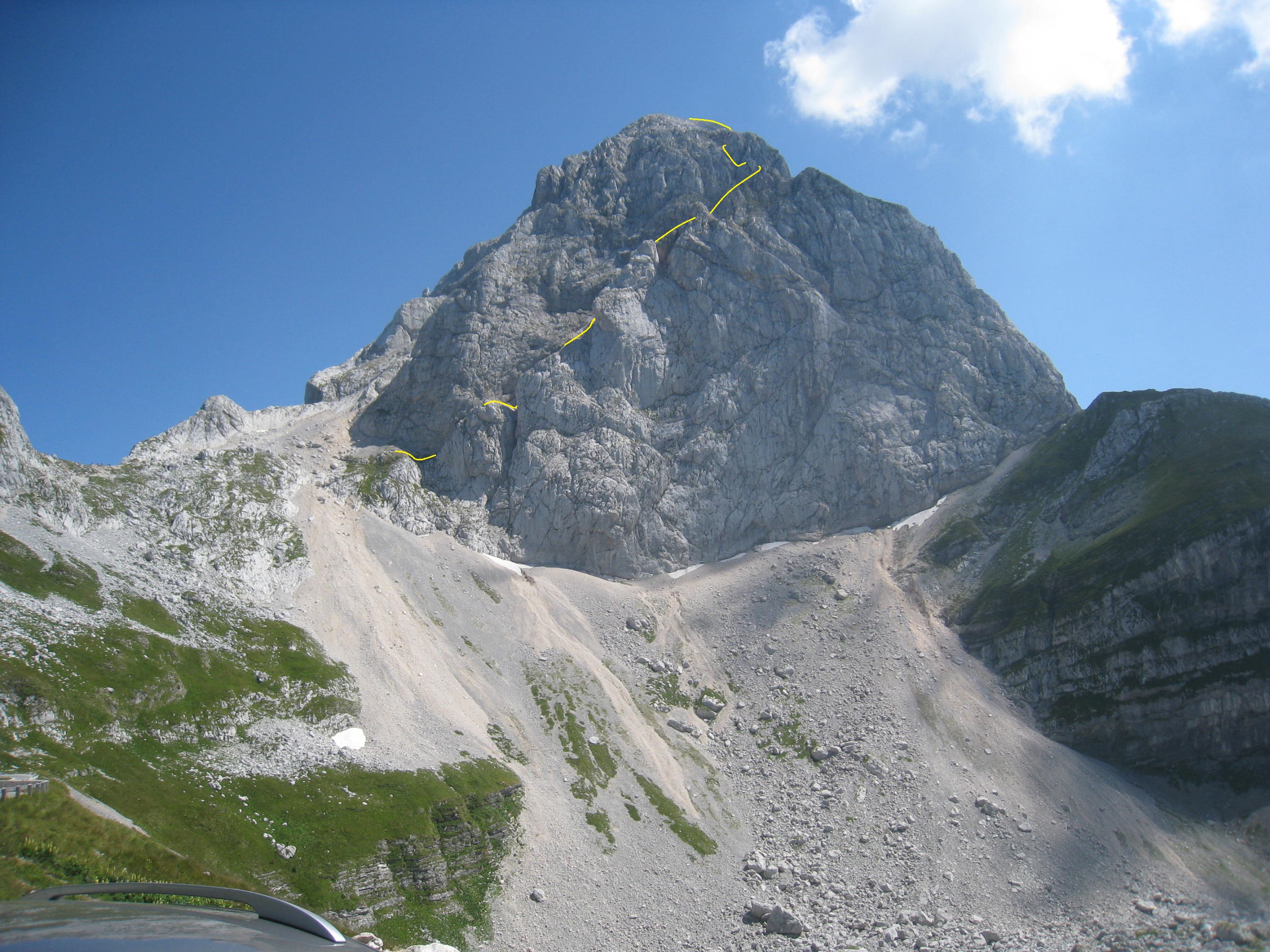Depuis le dernier parking, se diriger ver l'E, vers le col Mangartsko sedlo même (2166 m), fléché Mangart. Au départ du col, le chemin est encore en commun avec la voie normale. Suivre les indications Mangart. La voie slovène bifurque très bientôt sur la droite (fléché Slovenska pot) et rejoint sous peu la paroi même. L'itinéraire se déroule dans une atmosphère pittoresque (goulets, cheminées, terrasses, et un grand belvédère aux 2/3 de l'ascension), remontant toute la face W du Mangart en diagonale avant de sortir vers le sommet.