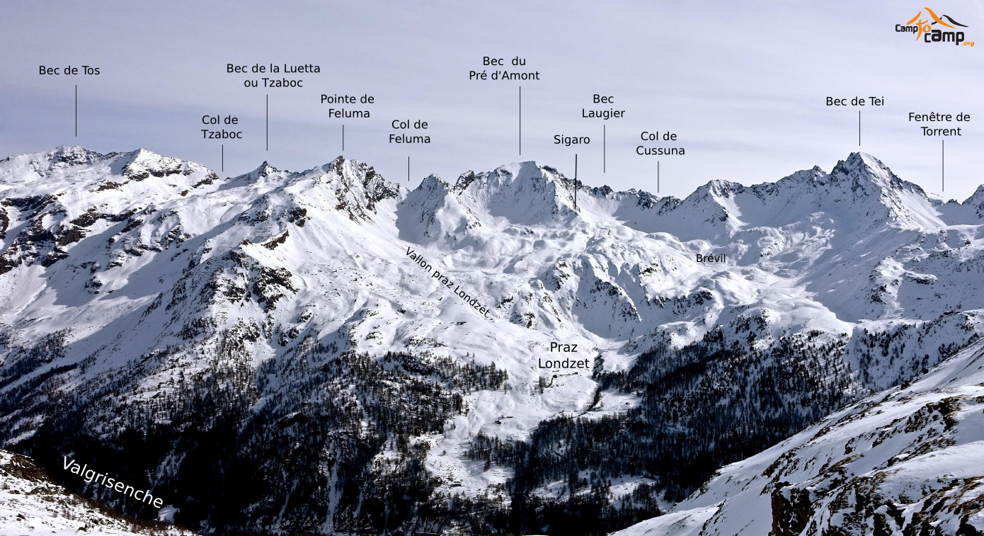 Depuis Valgrisenche /Mondanges suivre la route fermée en hiver montant à la retenue de Beauregard, la suivre rive droite jusqu'à la sortie du tunnel. Peu après prendre la route à gauche en direction du Rocher 1905 m, passer l'alpage de Prarion, poursuivre plein E par le vallon évident de Praz Londzet et le col de Feluma bien visible à son extrémité. Le caractère de la course change au pied du col, la pente se raidit considérablement. Les 250 derniers mètres de dénivelé sont les seules difficultés pour cette course relativement peu difficile par ailleurs. Les pentes sous le cols sont proches des 40°. Afin d'éviter d'éventuelles plaques, la rive droite du col, plus exposée au soleil et aux purges régulières depuis la pointe de Feluma, est souvent plus sûre. Belle corniche au col versant val de Rhêmes.