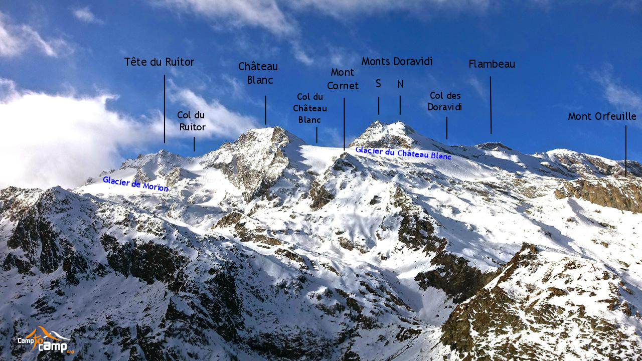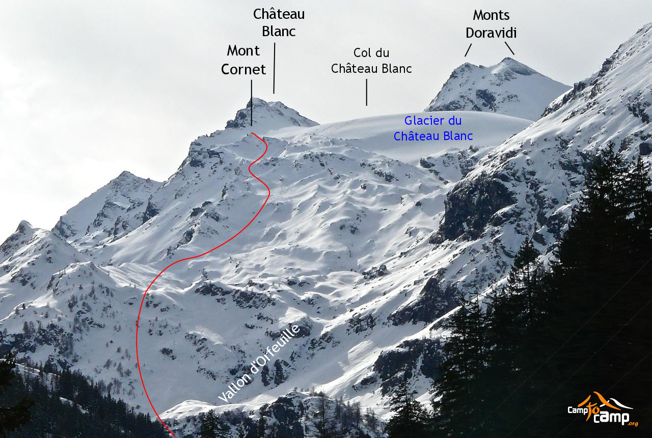 Depuis Planaval à 1560 m (Valgrisenche) prendre la piste (itinéraire no19) en direction de l'alpage d'Orfeuille (1985 m). De l'alpage, monter par la pente raide située directement derrière l'alpage rive droite du torrent d'Orfeuille, c'est la partie la plus raide du parcours. Ensuite continuer en passant au pied du bec de Cère. Par des petites combes évidentes et plusieurs paliers successifs atteindre peu avant le glacier de Château Blanc, aux environs de 3000 m, le pied du Mont Cornet. Petite marche à franchir pour atteindre le sommet à 3038 m.