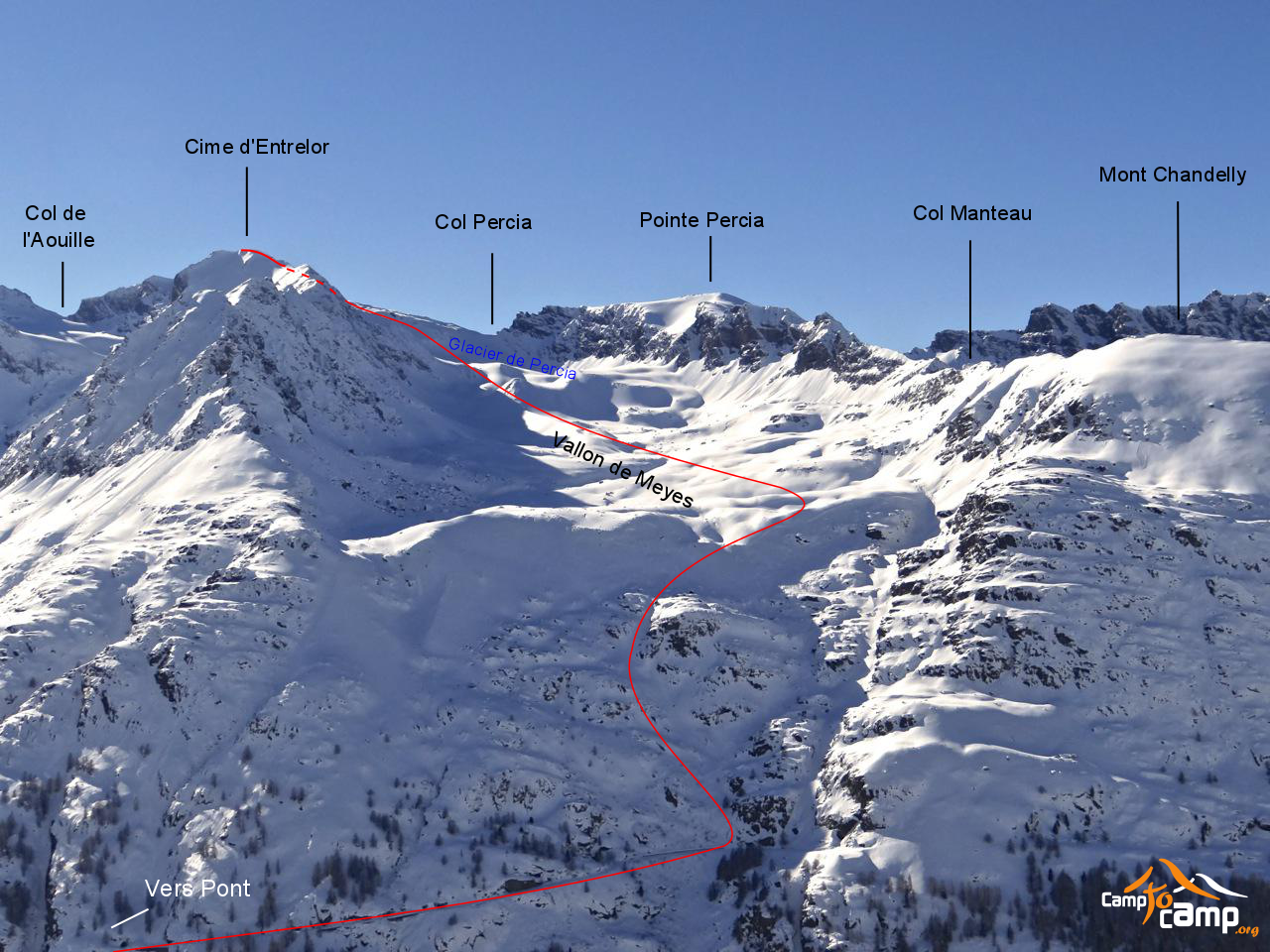 Depuis Pont, emprunter la route non aménagée jusqu'au col du Nivolé et suivre les premiers virages en épingle à cheveux. Après une portion plate atteindre le premier tunnel, le traverser. Continuer sur la route après la sortie du tunnel jusqu'au couloir raide, peu profond et de prime abord peu engageant qui descend de la vallée de Meyes. Tourner ensuite à l'W et en suivant des pentes assez raides, atteindre l'alpage du Meyes Damon à 2512 m, au-dessus duquel la vallée s'aplanit. Progresser au centre de la vallée. Puis franchir une crête et tourner à gauche pour rejoindre le glacier de Meyes (ou Pertcha). Une fois en vue de la ligne de partage des eaux avec la vallée de Rhêmes, tourner à droite et rejoindre la voie normale classique à 3391 m, d'où vous pourrez atteindre le sommet.