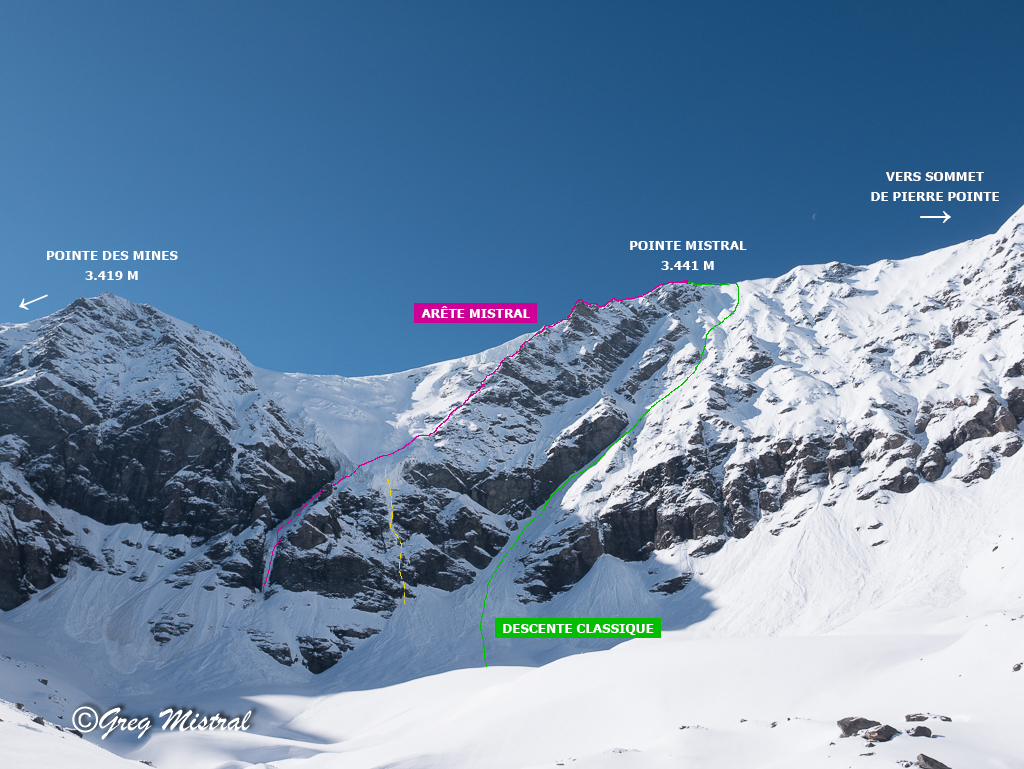- Par la [[routes/55056|Face N]] : en partant du sommet, descendre l’arête W en neige sur 50 m. Descendre la face N (5.3/E3, 42-45°/800m, passages à 50°). Repérage à faire avant l’ascension.
