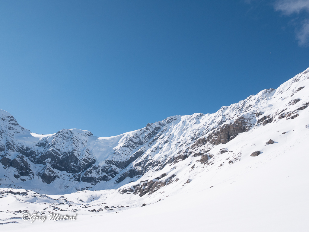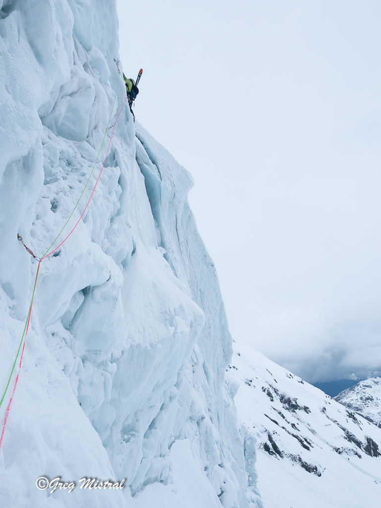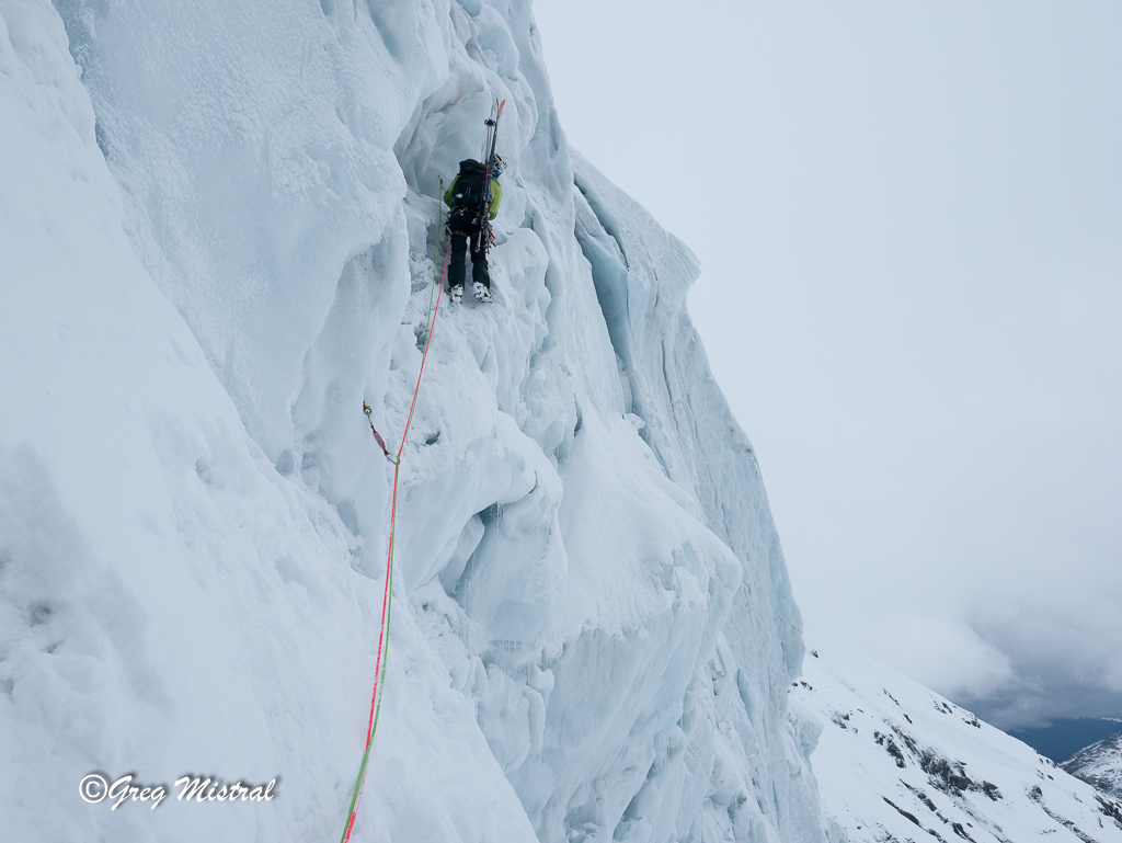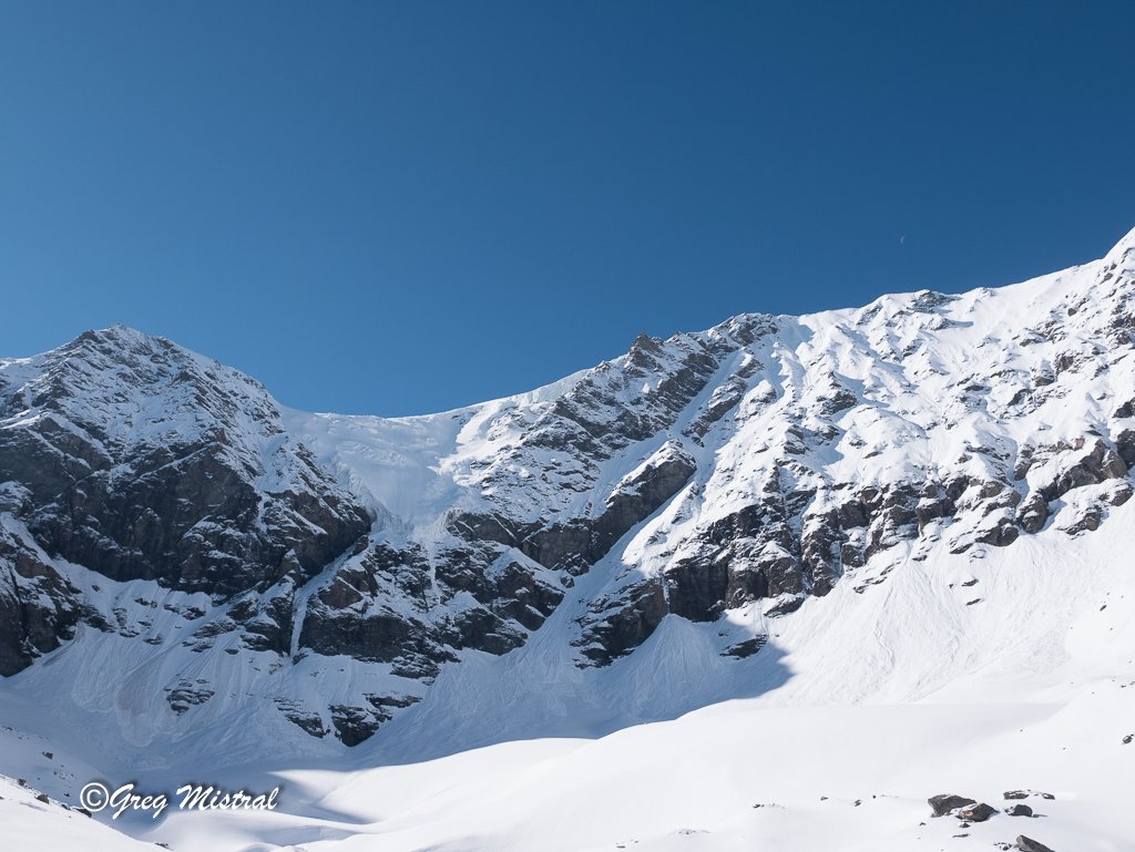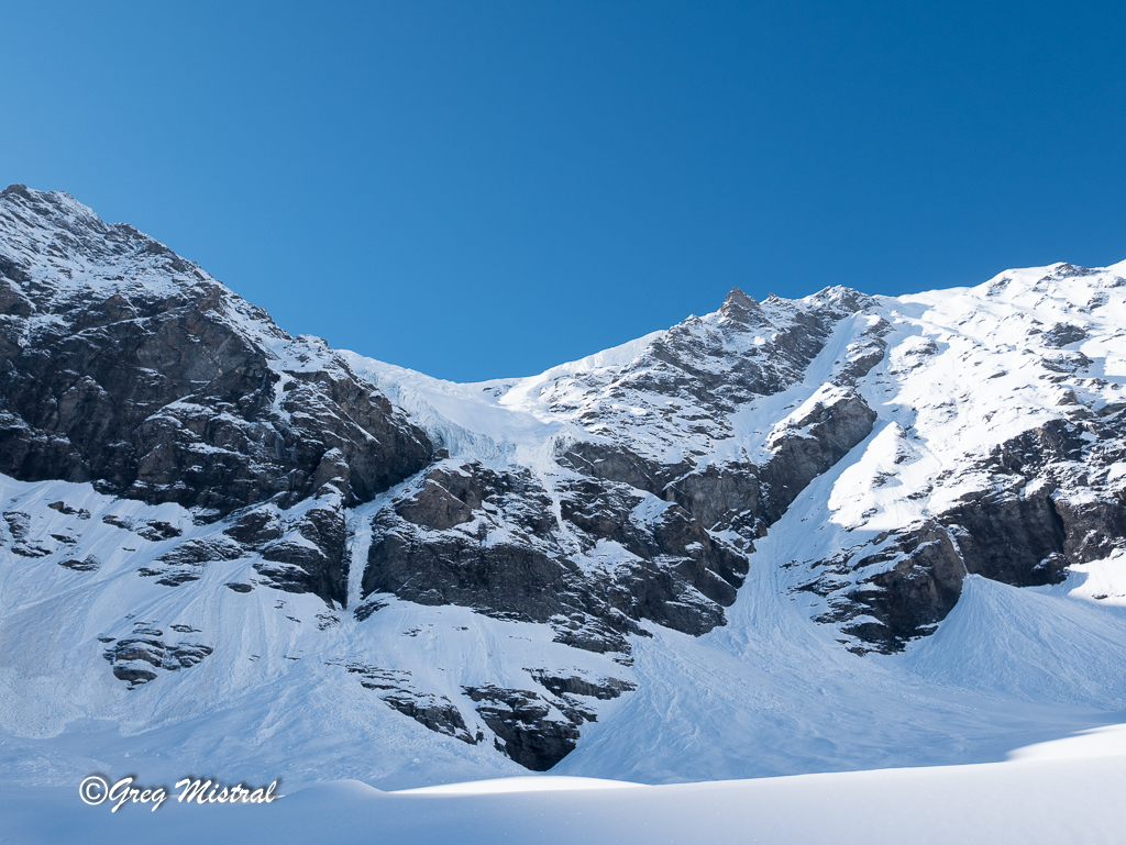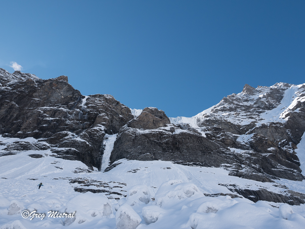 - Ligne de glace en bout de la langue du glacier. Deux longueurs de 60 m en 4+/5. Mais plus exposées aux séracs et au soleil.