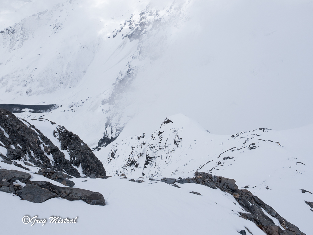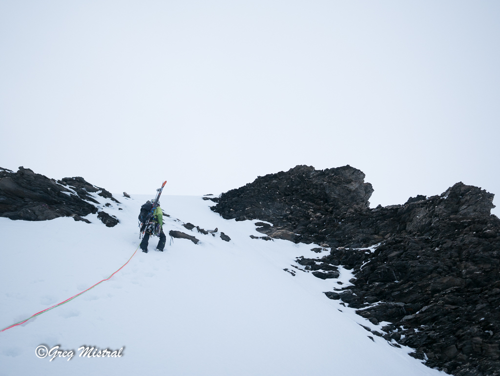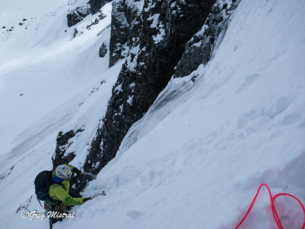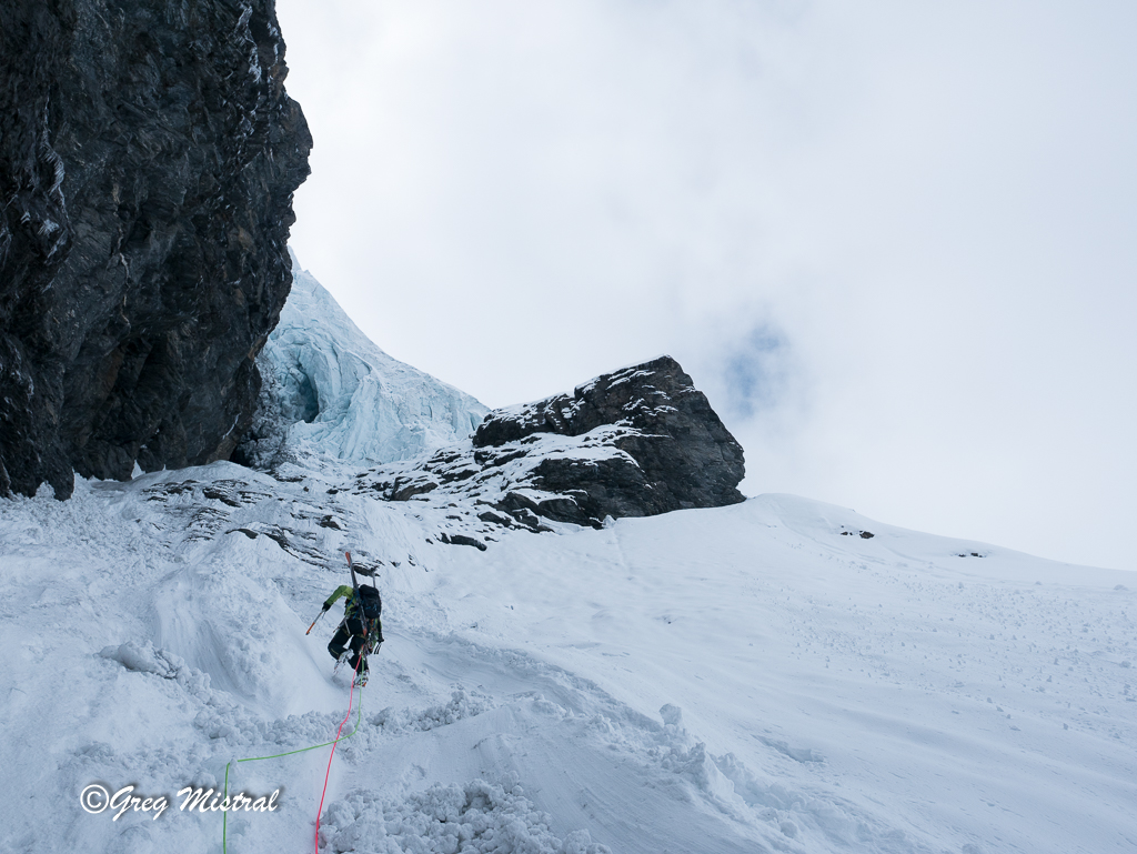 Bien rester sur le fil de l’arête. Rocher schisteux à nettoyer au fur et à mesure. De beaux passages très aériens effilés. Une ambiance extraordinaire face à toute la vallée d’un côté, et de l’autre une barre énorme de glace de la préhistoire.