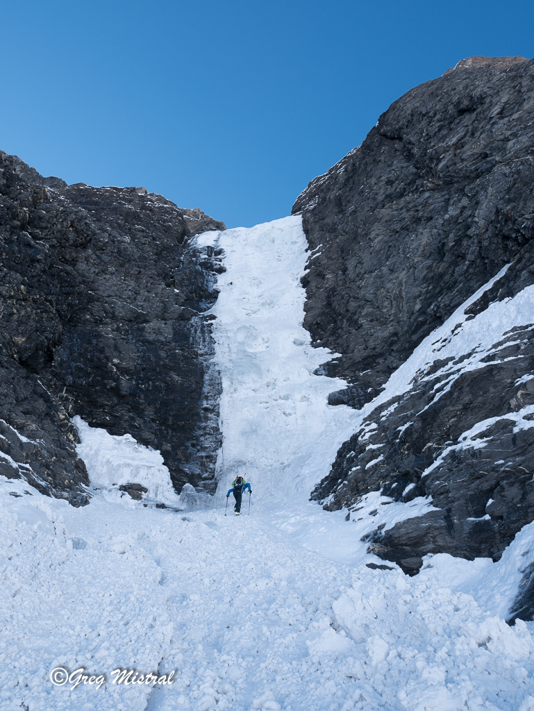 Grande rampe style goulotte neige et glace, peu raide, 280 m, arrivée sur un gros rocher au pied de la barre de séracs. Une longueur de 50 m, en 5/5+. En fonction de l’évolution du glacier, traversée déversante en montée. Relais sur broches (glace bleue très dure, éternelle).
