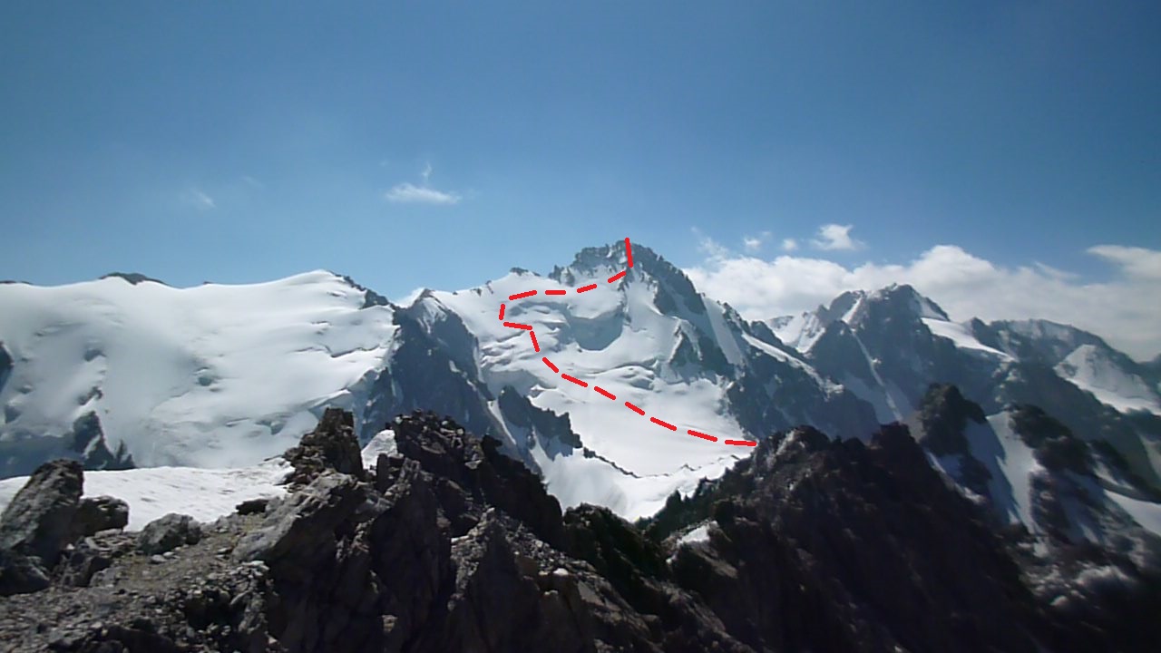 Du camp Radeska remonter la moraine vers le S, laisser la sente qui va vers la cabane Korona sur la droite pour s'élever sous la face E du pic Radseka (cairns). Longer le glacer par sa moraine rive droite jusqu'à la cabane Nauka. On rejoint le glacier une centaine de mètres plus loin. Contourner la 1re barrière de sérac par la gauche en cheminant sur un pierrier. Traverser le plateau horizontal au-dessus du sérac puis traverser sur la gauche pour rejoindre la cuvette du glacier. Continuer à traverser pour attaquer la pente raide (4250 m) plutôt rive droite afin de ne pas rester sous la grosse barre de séracs qui occupe le haut du glacier. Zigzaguer au mieux en fonction des crevasses et séracs en progressant vers le col situé au NE du sommet. 150 m sous ce col traverser franchement à droite au-dessus de la barre de séracs sur 200 m jusqu'à se trouver à l'aplomb du sommet. 60 m en glace à 50/55° puis 60 m en mixte amènent juste à droite et 10 mètres sous le sommet.