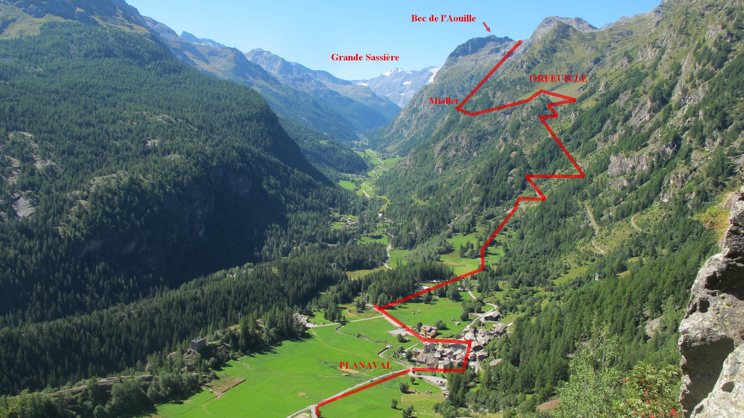 Du refuge degli Angeli, prendre le sentier qui descend vers les lacs de Morion (18). Contourner les lacs par la droite et poursuivre d'abord le long d'une crête puis par une traversée. Passe un col entre le Bec de l'Aouille et le massif du Ruitor. Continuer sur ce sentier, nombreux lacets (descente lente) jusqu'à atteindre la cabane de Miollet (1892 m). Juste après la cabane prendre à gauche un sentier (19), effectuer une longue traversée légèrement ascendante en sous-bois versant E du Becca Céré. Traverser sans difficulté quelques zones de dalles équipées de marches et mains courantes, avant d'attaquer une franche remontée en lacets dans des vernes jusqu'à la bergerie d'Orfeuille (1990 m). Suivre alors la piste jusqu'à Planaval.