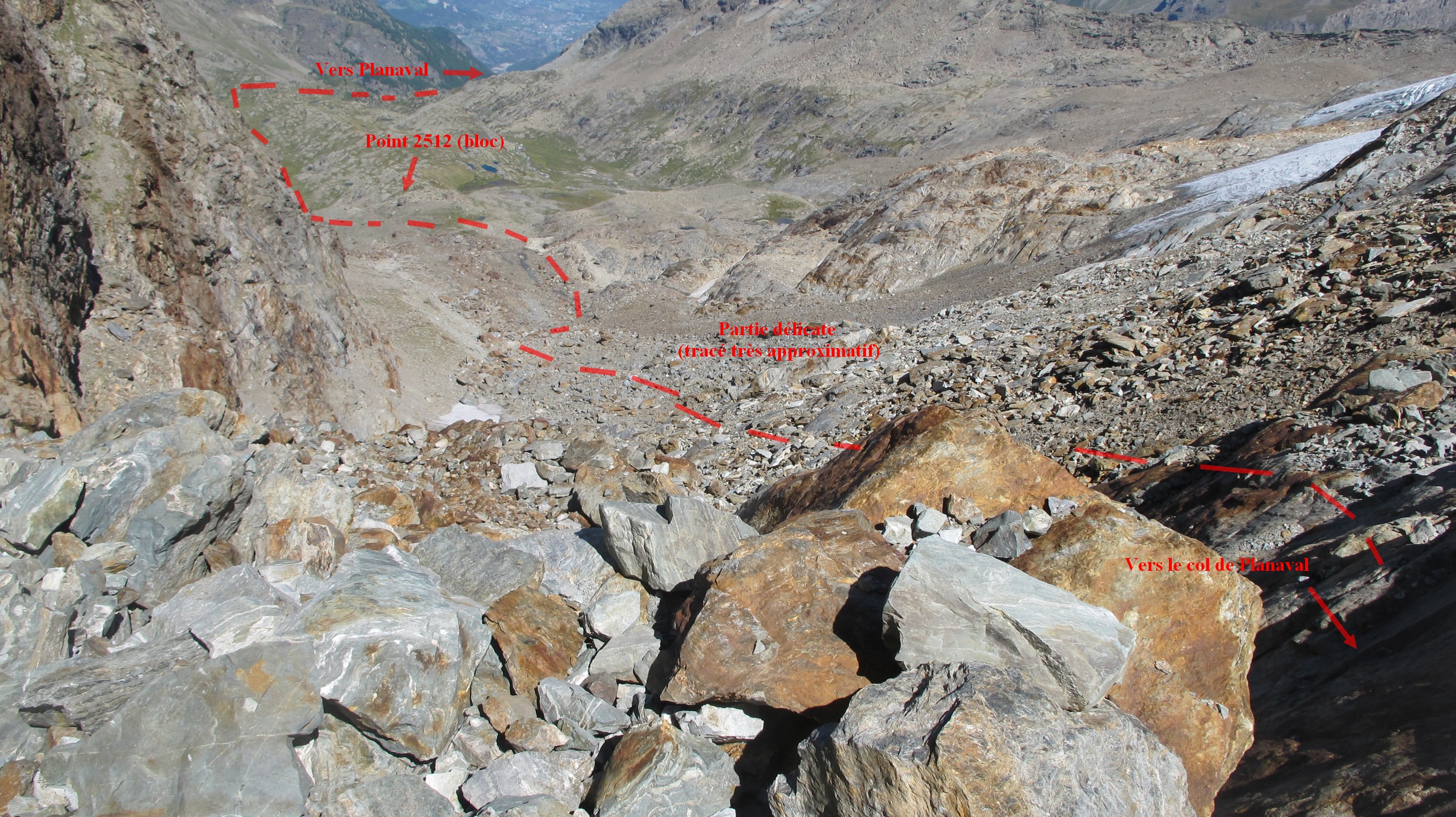 - Avertissement : toute la partie finale (200 à 300 m) de l'ascension du col de Planaval peut être en neige. Dans ces conditions, piolet, crampons, voire corde peuvent être utiles. Toutefois, en conditions sèches, cette partie reste très délicate, peut-être même plus dangereuse, et particulièrement pénible.
