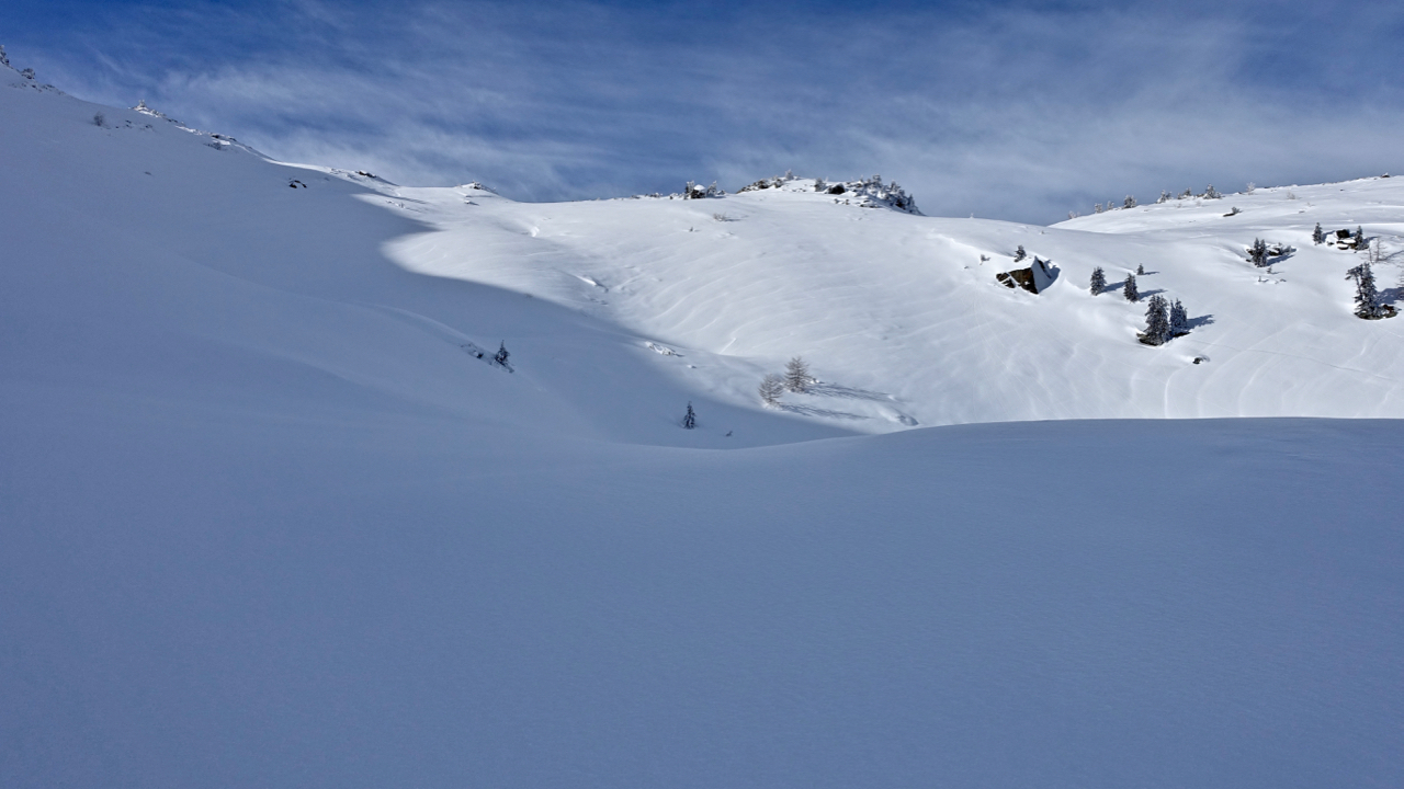Le plus facile pour atteindre le haut d'un couloir permettant une descente W en direction de Promoud est de viser soit à droite de la pointe Valettaz (facile) soit à gauche (pente plus raide et plus étroite tracé bleu sur la photo topo). À droite la crête est large est permet d'observer facilement le départ de plusieurs couloirs, une seul permet d'atteindre Promoud. Son départ est situé juste à un petit col au N de la pointe Vallettaz.