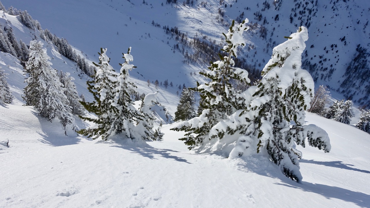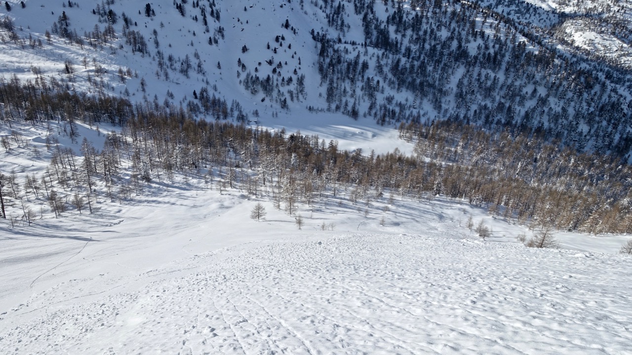 Le départ du couloir est raide et peut présenter, suivant l'enneigement, quelques rochers affleurants. Bien rester sur les petites croupes afin de tester la neige au début. Ensuite tirer à gauche et prendre plus au centre du couloir bien canalisé. La sortie sans encombre apparaît rapidement au tiers du couloir. Sinon ne pas trop insister pour ne pas se retrouver au-dessus d'un passage problématique. À la sortie du couloir canalisé, c'est une vaste et large pente qui s'ouvre jusqu'à une forêt de mélèzes bien aérée. Atteindre cette forêt continuer en direction de l'alpage de Promoud. Arrivé presque sur le replat prendre à droite NE et suivre globalement l'itinéraire du chemin d'été. Par un large couloir d'avalanche, souvent rempli par des coulées, descendre jusqu'à 1750 m avant de rentrer de nouveau dans une forêt dense d'épicéas pour arriver au plat du vallon de Lantaney au niveau des premières maisons du val du Fond. Prendre ensuite la piste d'alpage et la suivre jusqu'à Chabodey, c'est très long et souvent trop plat pour une bonne glisse s'il n'y a pas de trace.